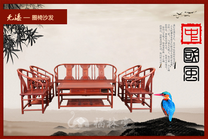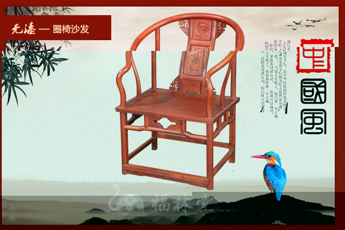 圈椅,因椅圈恰似羅圈,民間又稱“羅圈椅”或“圓椅”,圈椅的造型上圓下方,外圓內(nèi)方,這暗和了中國傳統(tǒng)文化中的乾坤之說,乾為天為圓,坤為地為方,而外圓內(nèi)方則是中國傳統(tǒng)文化中所崇尚的一種品德,雖在處事上有所圓滑但卻內(nèi)在有所堅(jiān)持。它最明顯的特征則是在圈背上連結(jié)著扶手,從高到低一順而下,座靠時可使人的臂膀都倚著圈形的扶手,感到十分舒適,頗受人們喜愛!