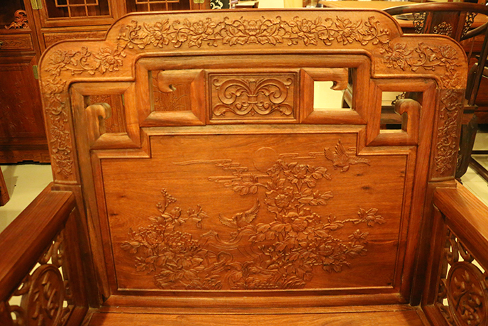 第三是中國的語言,它是紅木家具中出現(xiàn)頻率最高的圖案,福字紋、萬字紋、喜字紋、壽字紋,工匠們喜歡用文字來表達(dá)自己的美好祝福,給居室多增添生活氣息,掩蓋紅木家具給人的硬朗、威嚴(yán)的感覺。除了單個字體的文字外,其椅背等處還多見一些短語、警句、吉祥語或詩句,它們經(jīng)過特殊的美化變形處理后,也極具觀賞價值。