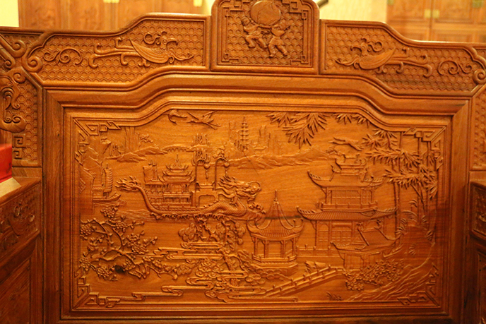 第四類,山水風(fēng)景圖案常常和人物圖案結(jié)合在一起,出現(xiàn)在紅木家具上,山水風(fēng)景多為名山大川,人物多是反映歷史典故、神話傳說、詩詞故事和文人生活的畫面,如游歸圖、南山觀瀑、五老圖、八仙圖、十八羅漢、嫦娥奔月、三星高照、群仙祝壽、百子圖、東籬采菊圖等,工匠們以中國畫的散點(diǎn)繪畫技法為基礎(chǔ)進(jìn)行生動描繪和勾勒。