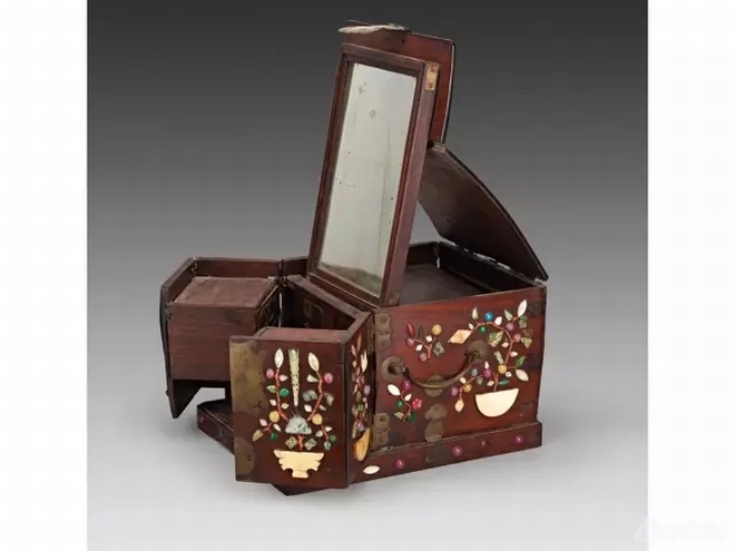 梳妝打扮是上至太后妃嬪,下至小家碧玉都喜愛的一種本能。而作為皇室,太后、妃嬪們所用的器物又更高端的多。北齊的胡太后,讓沙門靈昭,制造了七寶鏡臺,三十六個門戶各有一婦人,手中各自拿著鎖匙,只要輕碰其中一個門戶,這三十六戶一時全都自行關(guān)閉;若抽出其中一關(guān)的鎖匙,那么其余諸門,盡皆開啟,婦人都出現(xiàn)戶前站立。唐朝的馬登封也曾為皇后制妝臺,進退、開合全自動,都不須人力,巾櫛(梳篦的總稱)、香粉,依次遞送、循序進獻??匆姷娜?,都認為是鬼斧神工。